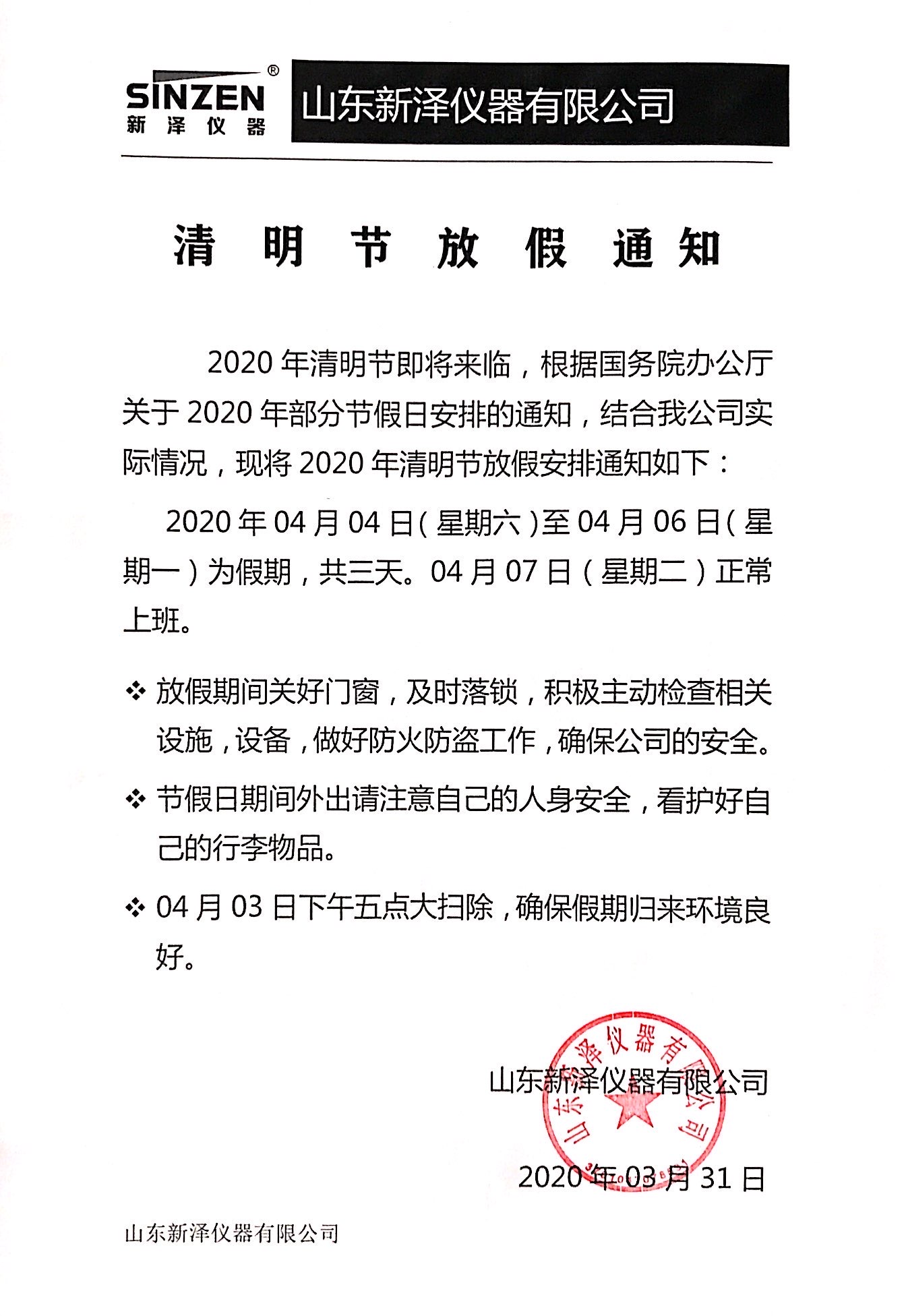山東新澤儀器:清明節(jié)放假通知(04.04-04.06)