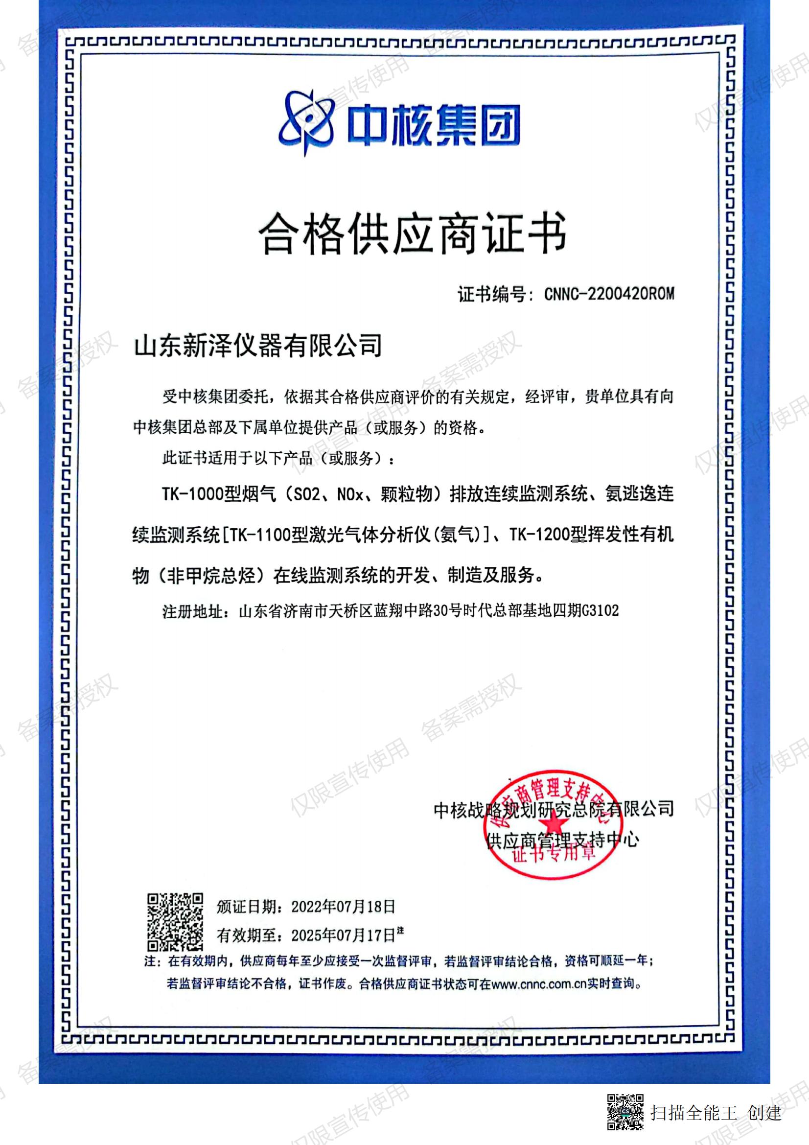 熱烈祝賀山東新澤儀器有限公司成為中核合格供應商
