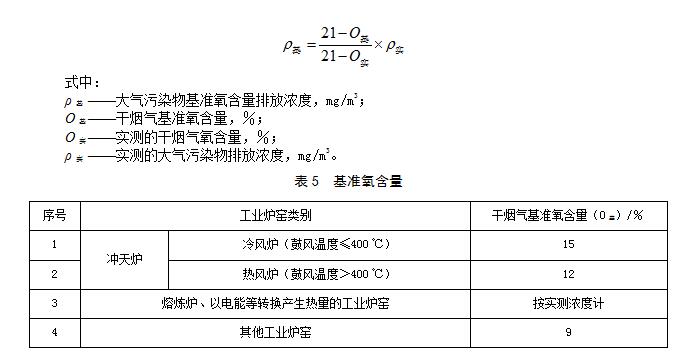 實測的工業(yè)爐窯排氣筒中大氣污染物排放濃度,應(yīng)按以下公式換算為基準氧含量下的排放濃度,并以此濃度作為判定排放是否達標的依據(jù)。各類工業(yè)爐窯的基準氧含量按表5的規(guī)定執(zhí)行。