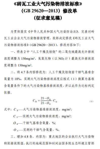 磚瓦工業(yè)大氣污染物排放標(biāo)準(zhǔn)修改單(征求意見稿)