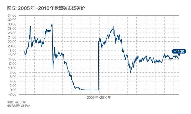 歐盟碳交易起始價(jià)較高,2005年初從15歐元/噸價(jià)位迅速上漲到28歐元/噸。但在2006年4月底,由于核查排放數(shù)據(jù)泄露,并顯示發(fā)放給成員國(guó)的碳配額總數(shù)遠(yuǎn)高于實(shí)際排放,碳配額嚴(yán)重過剩。導(dǎo)致每噸碳價(jià)從30歐元暴跌至10歐元。此后,由于配額不能存儲(chǔ)到下一階段導(dǎo)致碳價(jià)繼續(xù)暴跌,到2007年底接近零。