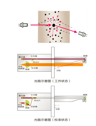 Sdust-100型煙塵濃度監(jiān)測儀采用激光后向散射測試原理完成對被測煙道的煙塵濃度的測定。Sdust-100其內(nèi)嵌的高穩(wěn)定激光信號源穿越煙道,照射煙塵粒子,被照射的煙塵粒子將反射激光信號,反射的信號強(qiáng)度與煙塵濃度成正變化。Sdust-100檢測煙塵反射的微弱激光信號,通過特定的算法即可計(jì)算出煙道煙塵的濃度。