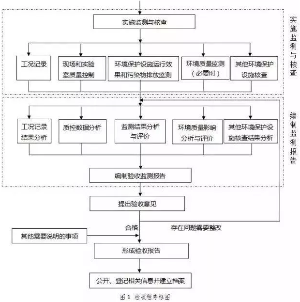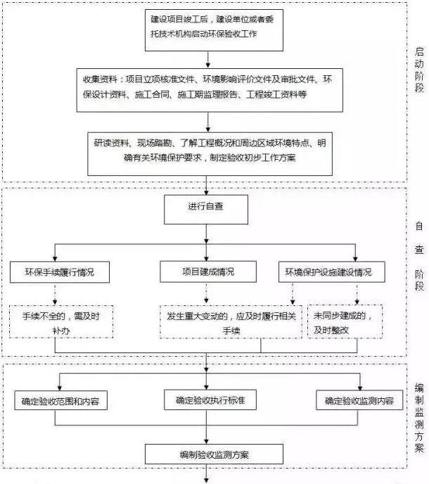 驗(yàn)收監(jiān)測(cè)工作可分為啟動(dòng)、自查、編制監(jiān)測(cè)方案、實(shí)施監(jiān)測(cè)和核查、編制監(jiān)測(cè)報(bào)告五個(gè)階段,具體工作程序見下圖: