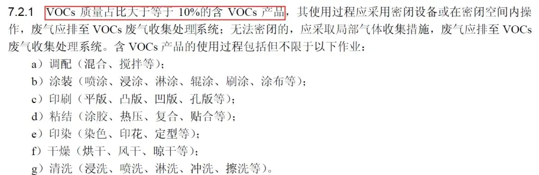無(wú)組織收集:鼓勵(lì)源頭削減,企業(yè)使用的原輔材料和產(chǎn)品中VOCs含量占比小于10%(質(zhì)量含量),根據(jù)本標(biāo)準(zhǔn)的相關(guān)規(guī)定豁免相應(yīng)的措施要求;可不要求采取無(wú)組織排放收集措施